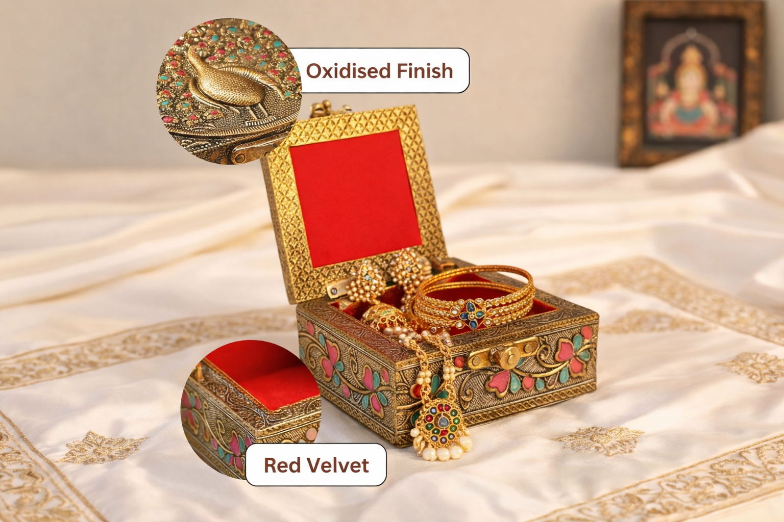 Handmade Wooden Oxidised Jewellery Organizer Storage Box with Lock Small Size | Wooden Jewellery Box for Necklace, Earrings, Rings